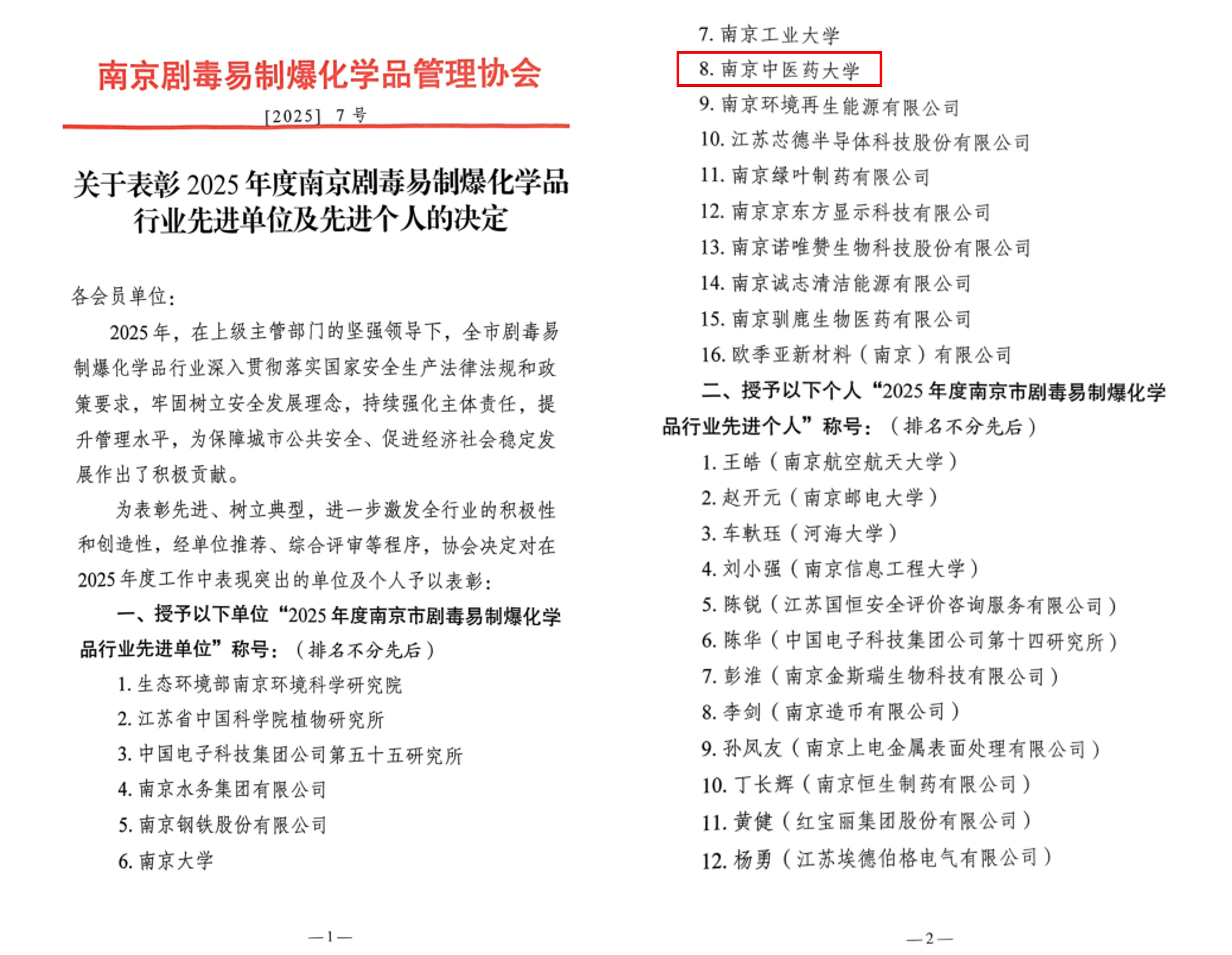 11日24日,南京剧毒易制爆化学品管理协会公布了《关于表彰2025年度南京剧毒易制爆化学品行业先进单位及先进个人的决定》,全市共有16家企事业单位入选先进单位,其中在宁高校3个。我校继去年后再次被授予“2025年度南京市剧毒易制爆化学品行业先进单位”称号。